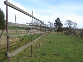 Tenter frames at Otterburn Mill. The cloth is attached to metal hooks at the top and bottom of the frame then the bottom bar is dropped to put the cloth under tension while it dries.