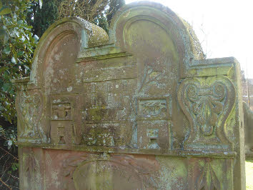 The tombstone of John Saint of Cocklaw Fulling Mill near Chollerton showing a detailed bas relief of his mill. The resemblance to the mill at Town Foot is extraordinary