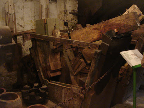 Woollen cloth, when first woven, has a very open texture so its usefulness can be greatly enhanced by a process of controlled shrinking and felting known as fulling. The cloth is immersed in a natural detergent solution, sometimes stale urine, sometimes a solution made form burned bracken, animal fat and lime and is pounded by hammers or stocks powered by a water wheel. As the wheel turns, a camshaft lifts the stocks and releases them to fall into a specially shaped wooden butt containing the cloth.