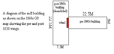 The wheel, which was attached to the north west wall of the original building and sunk into a deep wheel-pit, would have become enclosed when the new wing was added. This is not an unusual arrangement as it ensures that the mill wheel can operate in all seasons, even at temperatures below freezing. It seems likely that the stocks continues to be housed on the lowest floor of the main building whilst the northern building was added to house the new power-driven weaving frames. Perhaps this wing was the “New Building containing byre for 4 cows, two-stall stable, barn and pig house with a large weaving room above, the whole of stone with blue slate” mentioned in the 1855 survey.